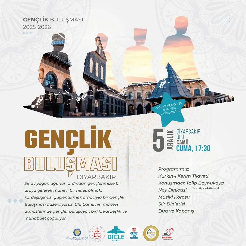 Diyarbakır Ulu Camii’nde düzenlenen gençlik buluşmasında Kur’an tilaveti, müftü konuşması, ney ve musiki dinletileri ile şiir sunumları gerçekleştirildi. Manevi atmosferde birlik ve kardeşlik dolu bir akşam yaşandı, program dua ile sona erdi.